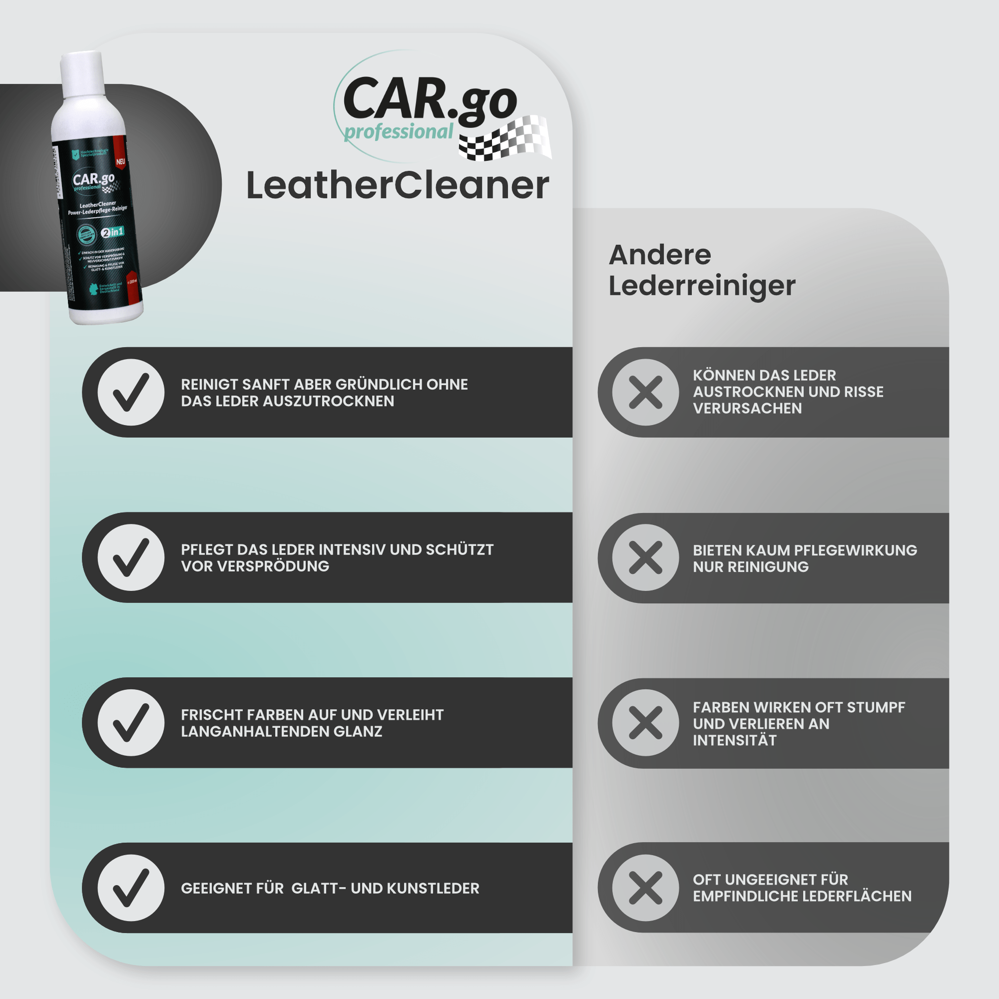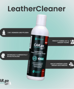 CAR.go LeatherCleaner is a high-quality 2-in-1 cleaner that cleans and cares for real and artificial leather at the same time – gently, effectively and without leaving any residue. Developed for sensitive leather surfaces, it prevents drying out and embrittlement and at the same time refreshes the colour.
