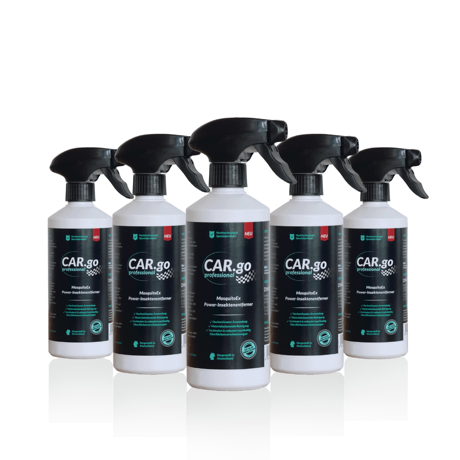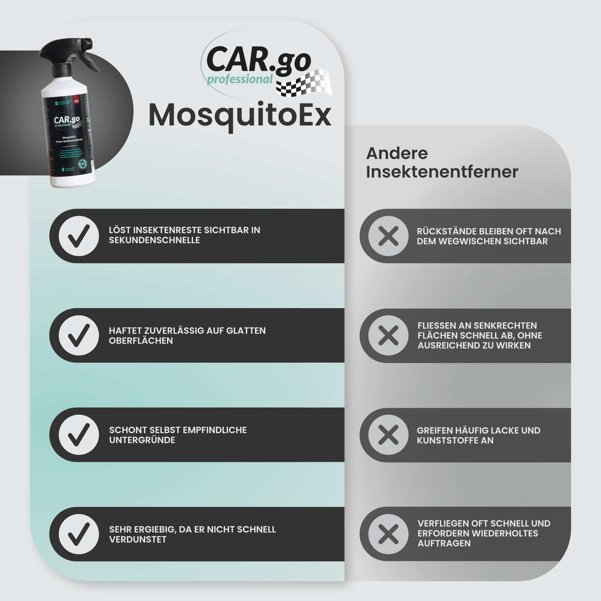 CAR.go MosquitoEx breaks down insect residues within seconds while being gentle on sensitive surfaces like paint and plastic. Its acid-free formula adheres to smooth and vertical surfaces without running off or evaporating quickly – ensuring deep cleaning with minimal effort.